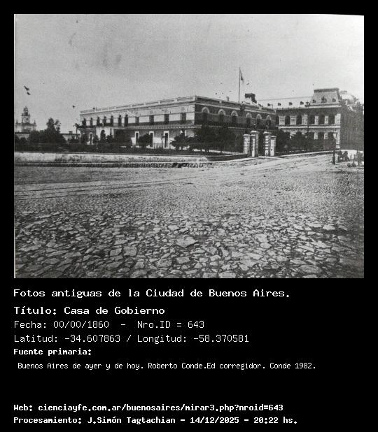 Casa de Gobierno - 00/00/1860 - [643] - Orden: 4 En el centro se destaca la Casa de Gobierno, última fracción del fuerte y que fuera ocupada por Nicolás Avellaneda desde 1874 hasta 1880. La torre que se ve sobre la izuierda corresponde a la Aduana nueva (Plaza Colón). Desde 1899 los tranvías funcionan con caballos. La calle estaba empedrada y la plaza tenía adoquines. Julio Roca asume en 1882 y resuelve la demolición de la vieja casa y construyen una similar a la Casa de Correos. Luego se unieron las casas con la construcción de un cuerpo central, a cargo del arq. Francisco Tamburini.