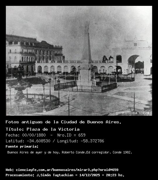 Plaza de la Victoria - 00/00/1880 - [659] - Orden: 10 Se ve la Plaza en 1880. También se ven las fuentes que se inauguraron en 1868. Se ve el Teatro Colón, y la pirámide con las cuatro estatuas que venían del Banco de la Provincia de Buenos Aires.
