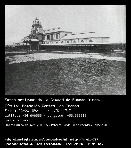 Estación Central de Trenes - 00/00/1890 - [717] - Orden: 32 Las autoridades del Ferrocarril del Norte al ver que el tráfico de pasajeros aumentaba enormement y considerando que el servicio de tranvías era insuficiente solicitaron el permiso para prolongar la línea hasta Paseo Colón (hoy L.N. Alem) y Piedad (Bartolomé Mitre) donde se construyó la nueva terminal llamada Estación Central. A esta llegaron los trenes del norte y del sur. Los del norte corrían por LN Alem entre unas verjas de hierro con pocas barreras. La estación se quemó el 14 de febrero de 1897. El gobierno no autorizó su reconstrucción y Retiro volvió a ser la cabecera. Se originó un pleito hasta 1933 (y en un momento hubo allí un galpón de ferrocarriles - se levantó todo, verja, galpón y rieles).