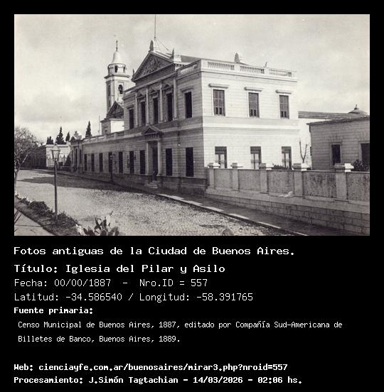 Iglesia del Pilar y Asilo - Fecha: 00/00/1887 - [Id: 557] El Asilo fue desarticulado. Hoy es un centro de exposiciones. Fuente:Censo Municipal de Buenos Aires, 1887, editado por Compañía Sud-Americana de Billetes de Banco, Buenos Aires, 1889.