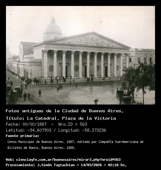 La Catedral. Plaza de la Victoria - Fecha: 00/00/1887 - [Id: 563] Se ve en el fondo (sobre la izquierda) el edificio del Banco Provincia. Fuente:Censo Municipal de Buenos Aires, 1887, editado por Compañía Sud-Americana de Billetes de Banco, Buenos Aires, 1889.