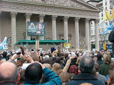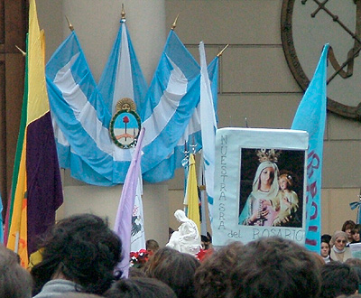 Imagen de la Virgen de Luján repartida durante la Marcha de Corpus que incluye el lema de la XXXII Peregrinación a realizarse este año