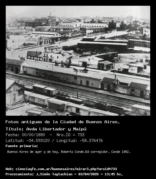 Avda Libertador y Maipú - Fecha: 00/00/1880 - [Id: 733] Fecha aproximada. Se destaca la primitiva estación Retiro cuando la terminal era la Estación Central en Bmé Mitre y L.N. Alem. Se la futura Plaza San Martín (se destaca Maipú que baja de derecha a izquierda, sin el cantero central, y sin el monumento a Alem inaugurado el 10/oct/1925). En la parte alta de la barranca está el Cuartel de Retiro ya reformado con su piso superior (alojó al 'Batallón Provincial'). Fuente:Buenos Aires de ayer y de hoy. Roberto Conde.Ed corregidor. Conde 1982.