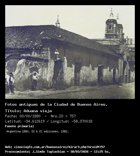 Aduana vieja - Fecha: 00/00/1880 - [Id: 757] Fecha aproximada. La Casa pertenecía a Domingo Basavilbaso quien la construyó en 1782, perteneciendo después a la familia Azcuénaga. La aduana funcionó allí hasta 1857. En el fondo se observa la Iglesia de Santo Domingo. Fuente:Argentina 1880, SS & CC ediciones. 1982.