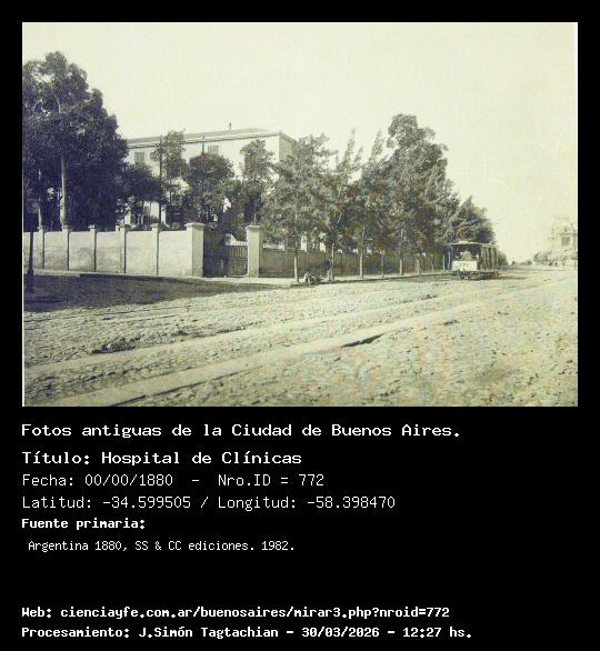 Hospital de Clínicas - Fecha: 00/00/1880 - [Id: 772] El Hospital se inauguró el 25/ene/1879. Esta es la esquina de Córdoba y Uriburu. Sobre Córdoba se ven las trotaderas o sendas para los carruajes. Al fondo, a la derecha -muy chico- se ve el edificio de Obras Sanitarias. Fuente:Argentina 1880, SS & CC ediciones. 1982.
