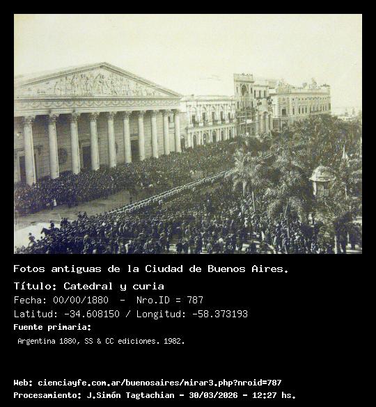 Catedral y curia - Fecha: 00/00/1880 - [Id: 787] Se ve la Catedral en un día festivo. También se ve, sobre la Plaza de mayo, el kiosco octogonal -tipo francés- que aparece en muchas tomas de la Catedral de frente. Fuente:Argentina 1880, SS & CC ediciones. 1982.