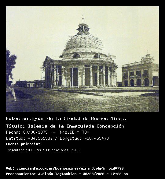 Iglesia de la Inmaculada Concepción - Fecha: 00/00/1875 - [Id: 790] Está ubicada frente a la plaza Manuel Belgrano. Inició la obra el ingeniero Nicolás Canale, siendo colocada la piedra fundamental el 23 de enero de 1865 y termina la construcción el arquitecto Juan A. Buschiazzo el 8 de diciembre de 1875 Fuente:Argentina 1880, SS & CC ediciones. 1982.