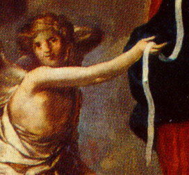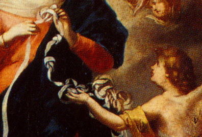 ![]() Uno de los ángeles le alcanza una cinta con nudos grandes y pequeños, separados y amontonados. Estos nudos representan el pecado original y sus consecuencia y nuestros propios pecados que impiden que la gracia fluya libremente a través de la cinta de nuestra vida.