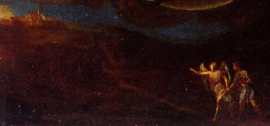 ![]() En la parte inferior de la imagen, podemos ver el desligue de un nudo terminado: un angel y un hombre, y entre ellos un perro, uno que se dirige hacia una iglesia. Se puede interpretar la historia del libro de Tobías (Tob 6:13) donde el joven Tobías realiza un largo y penoso viaje donde conoce a Sara. Sara ya se había casado siete veces pero a causa de un demonio que estaba enamorado de ella, todos sus esposos murieron en la noche de bodas. Tobías logra casarse con ella y volver a la casa de su padre. Eso nos dice que muchas veces, para que dos corazones se encuentren primero, tienen que desatarse muchos nudos.