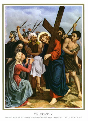 Sexta Estación: La Verónica seca el rostro de Jesús. Esta estación representa el lugar donde la piadosa Verónica limpió el rostro del Señor, quedando estampadas en el lienzo las facciones de Jesús. |