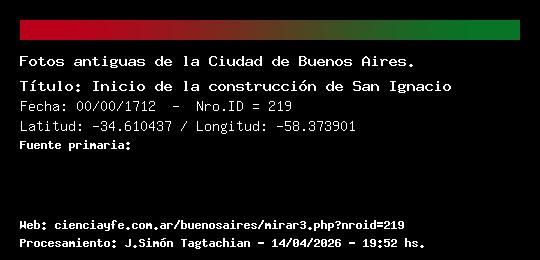Inicio de la construcción de San Ignacio - 00/00/1712 - [219] - Orden: 1 Juan Krauss comienza en 1712 la construcción de San Ignacio. Luego la continúa Juan Wolff (ambos jesuitas) y la termina Andrés Blanqui (también jesuita). Fuente: TEH-525 p33.