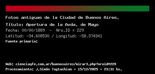 Apertura de la Avda. de Mayo - 00/00/1889 - [229] - Orden: 22 Poco importaba a los dirigentes "porteños" de 1889, impregnados de un espíritu progresista y constructivista de una República en crecimiento, la historia y el significado simbólico del Cabildo de Buenos Aires cuando tres arcadas del ala Norte fueron demolidas para indicar la apertura de la avenida Confrontar: www.almargen.com.ar/sitio/seccion/turismo/baires3/index.html