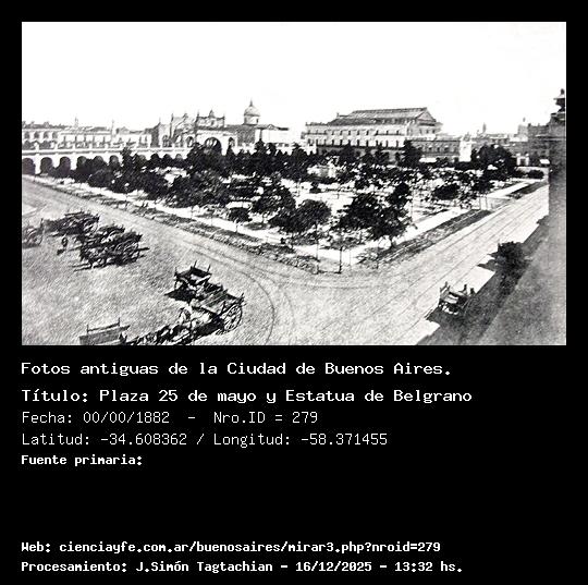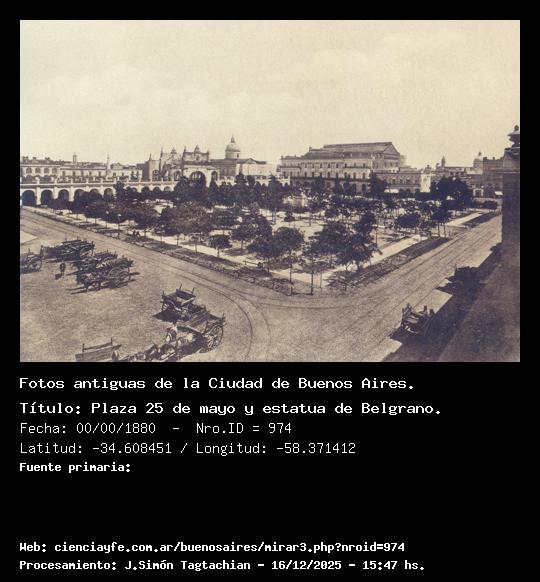 Plaza 25 de mayo y estatua de Belgrano. - 00/00/1880 - [974] - Orden: 18 La plaza Mayor, que se extendía entre el Fuerte y el Cabildo, quedó dividida en dos en el año 1800, al construirse la Recova (Recoba). En la parte este, lindando con el Fuerte, se improvisaban a diario puestos, a modo de feria, para la venta de toda clase de abastos, lo que contribuyó a que se llamase "Plaza del Mercado", nombre que fue sustituido por el de "25 de mayo", algunos años más tarde. Completamente transformada durante la presidencia de Sarmiento, se erigió en su centro la estatua ecuestre de Belgrano, cuya inauguración se efectuó el 24 de septiembre de 1873.