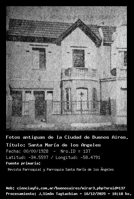 Santa María de los Angeles - 00/00/1928 - [137] - Orden: 1 Primera capilla ubicada Congreso 3742 . Constituye el primer templo del barrio de Coghlan. Fue inaugurada el 22 de Julio.