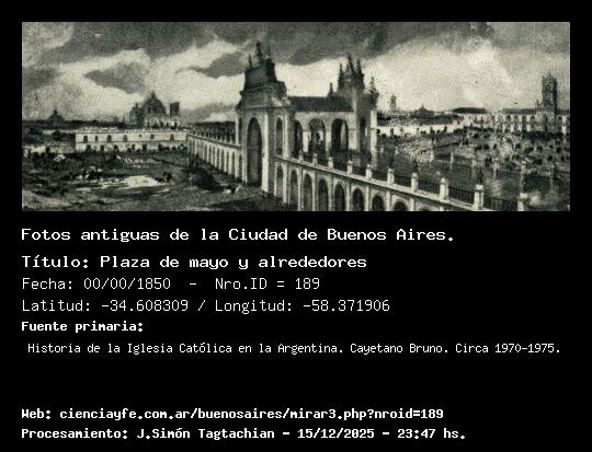 Plaza de mayo y alrededores - 00/00/1850 - [189] - Orden: 12 Fecha estimada. Pintura realizada -no en fecha- por Leonie Mathhis (1883-1952). Se ve el Cabildo y la Plaza Mayor. En el centro la Recova vieja comenzada en 1802 y demolida en 1884. A la izquierda la Plaza de la Victoria donde se rindió Beresford en 1806. Las torres que se divisan de izquierda a derecha son: San Telmo, San Francisco con las torres truncas, la Recova, San Ignacio y el Cabildo.