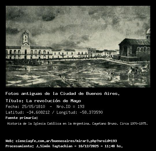 La revolución de Mayo - 25/05/1810 - [193] - Orden: 4 El 25 de mayo de 1810 según Léonie Matthis -pintado fuera de época-. Día lluvioso, con charcos y barro en la Plaza, deshecha por las carretas y las cabalgaduras. Sobresale el edificio del Cabildo; a continuación el antiguo Seminario, la Policía, la casa de Riglos, la de la familia Mallo -primera de dos pisos que hubo en la Ciudad; y la Catedral -sin la fachada que se terminó en 1862-.