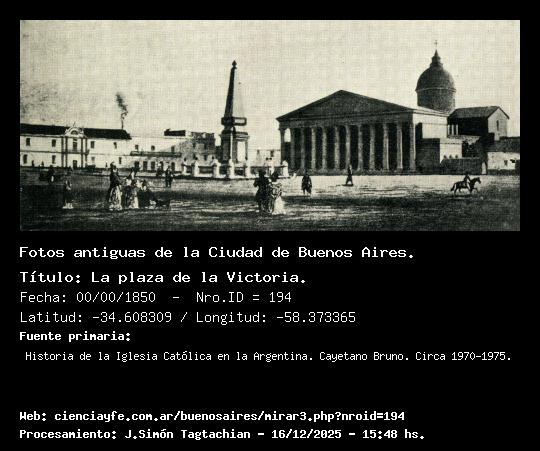 La plaza de la Victoria en 1860 - 00/00/1860 - [199] - Orden: 15 La plaza de la Victoria por años de 1860, vista desde el Cabildo. De izquierda a derecha: teatro Colón, pirámide de Mayo, Recova vieja y, al fondo, el Fuerte.