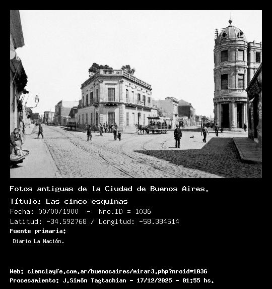 Las cinco esquinas - 00/00/1900 - [1036] - Orden: 2 La intersección de Juncal y Libertad, donde nacía la Calle Larga de la Recoleta (que fue luego Avenida de la República y, más adelante, Quintana). Unos metros más adelante, hacia Parera, estaba la estación 5 esquinas del tranvía, cuya concesión original se entregó en 1869.