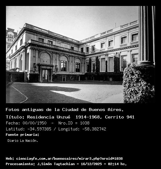Residencia Unzué 1914-1968, Cerrito 941 - 00/00/1950 - [1038] - Orden: 13 Encargada por Saturnino J. Unzué al prestigioso arquitecto francés René Sergent, fue construida entre 1914 y 1916, y se ubicaba frente a la Plaza Libertad. Allí habitó junto a su mujer Inés Dorrego Lezica (sobrina de Magdalena, la propietaria de la residencia Ortiz Basualdo) y su hija Juana Díaz Unzué, quien en 1934 contrajo matrimonio con el duque de Luynes y se trasladó a Francia. Siguiendo el estilo que Sergent adoptó con maestría en otras obras de su autoría, las fachadas recreaban el neoclasicismo francés del siglo XVIII.