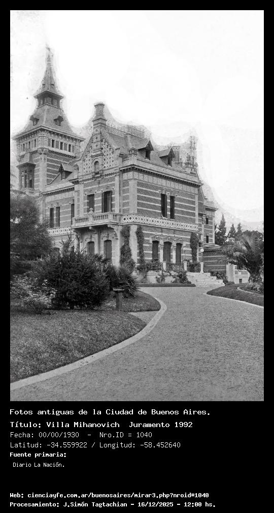 Villa Mihanovich Juramento 1992 - 00/00/1930 - [1040] - Orden: 5 ue su comitente Nicholas Bouwer, llegado al país como agente de la Baring Brothers, y luego director de los Ferrocarriles Central Argentino y Oeste. Levantada entre 1889 y 1890, fue proyectada por los arquitectos Alejandro Christophersen y Carlos Kihlberg y construida por el empresario Giuseppe Maranesi. (Circa 1889-1940)
