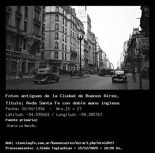 Avda Santa Fe con doble mano inglesa - 00/00/1936 - [27] - Orden: 6 Hermosa toma de Santa Fe con autos orientados según la mano inglesa de conducción.