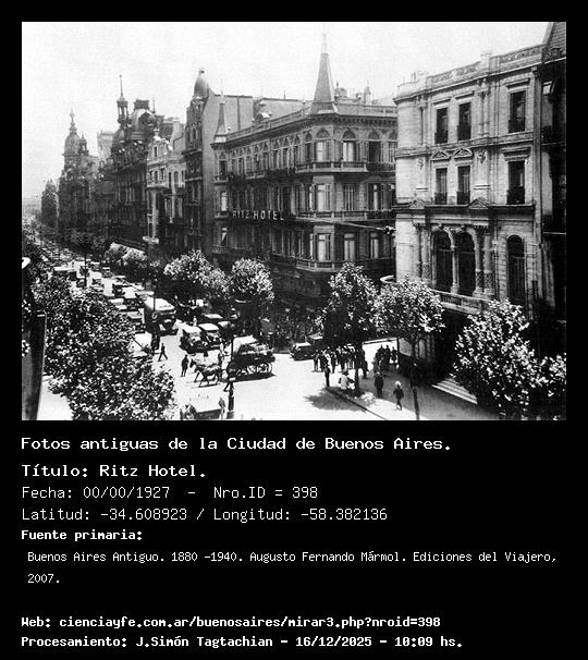 Ritz Hotel. - 00/00/1927 - [398] - Orden: 24 Avda de Mayo y Cerrito. El edificio de la derecha desapareció en 1937 cuando se realizó la apertura de la Avda 9 de julio. El Ritz Hotel, que aún existe, perdió, la torreta de su esquina.