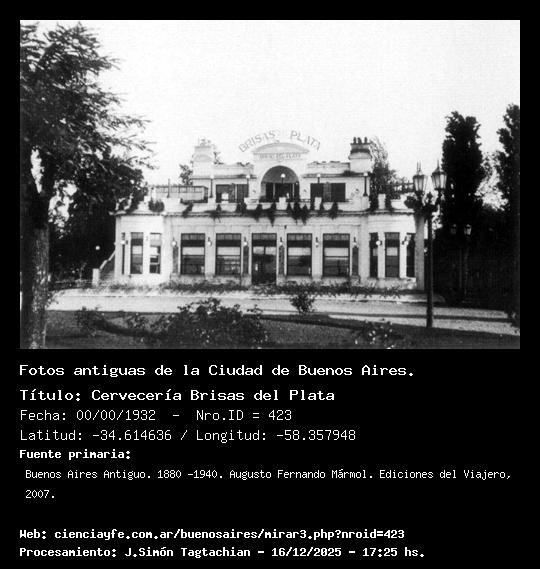 Cervecería Brisas del Plata - 00/00/1932 - [423] - Orden: 34 Construida por el Arq. Andrés Kálnay. Su edificio hermano, la Cervecería Don Juan de Garay que formaba un abanico estando a su derecha, fue demolida.