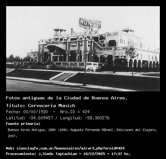 Cervecería Munich - 00/00/1930 - [424] - Orden: 32 Obra del Arq. Andrés Kálnay. Se construyó en 1927 y se inauguró el 21 de diciembre de 1927. Se hizo sin máquinas de construcción y se terminó íntegramente en 4 meses y 8 días.