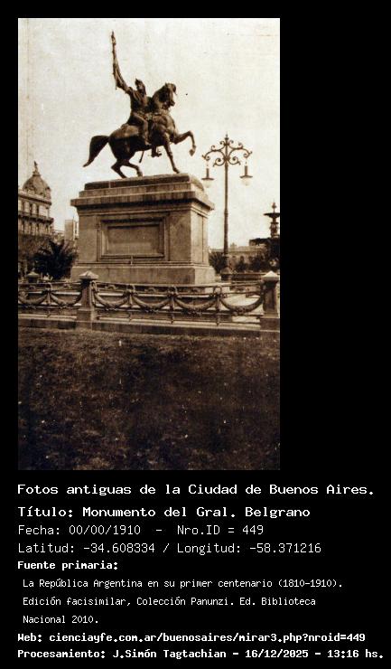 Monumento del Gral. Belgrano - 00/00/1910 - [449] - Orden: 10 Monumento al Gral. Belgrano en la Plaza de Mayo. Al fondo, se observa el Cabildo "chato".