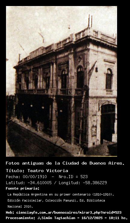 Teatro Victoria - 00/00/1910 - [523] - Orden: 84 Estaba ubicado en la Calle Victoria (hoy Hipólito Yrigoyen) y San José. Esquina sudeste.