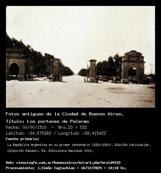 Los portones de Palermo - 00/00/1910 - [532] - Orden: 92 Los Portones de Palermo. Existieron de 1875 a 1917, año en que fueron demolidos. Constituían el acceso al Parque Tres de Febrero que se cerraba por las noches.