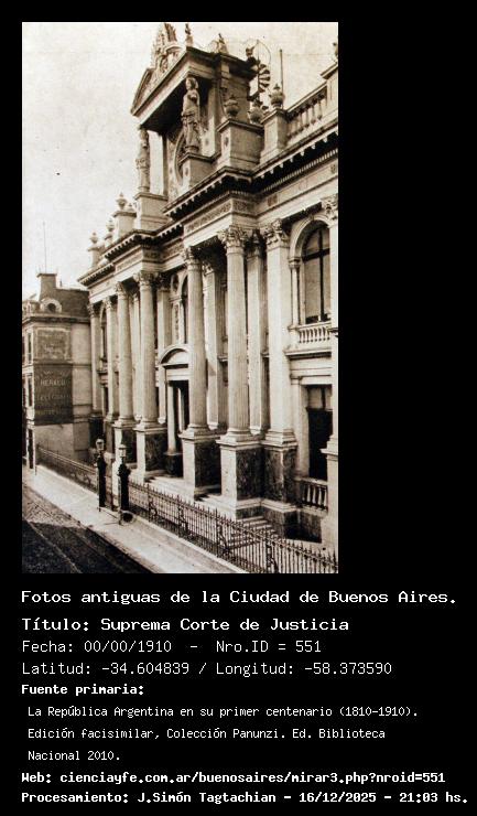 Suprema Corte de Justicia - 00/00/1910 - [551] - Orden: 111 Al parecer, este edificio fue erigido entre 1872 y 1876 para ser sede del Banco Hiptecario de la Prov. de Buenos Aires. En 1910 fue Suprema Corte de Justicia (eso dice el epígrafe de la foto), y en la actualidad es la sede del Banco Central. Está sito en la calle San Martín 275. Tiene un edificio muy similar construido en su contrafrente en 1940, sobre la calle Reconquista.