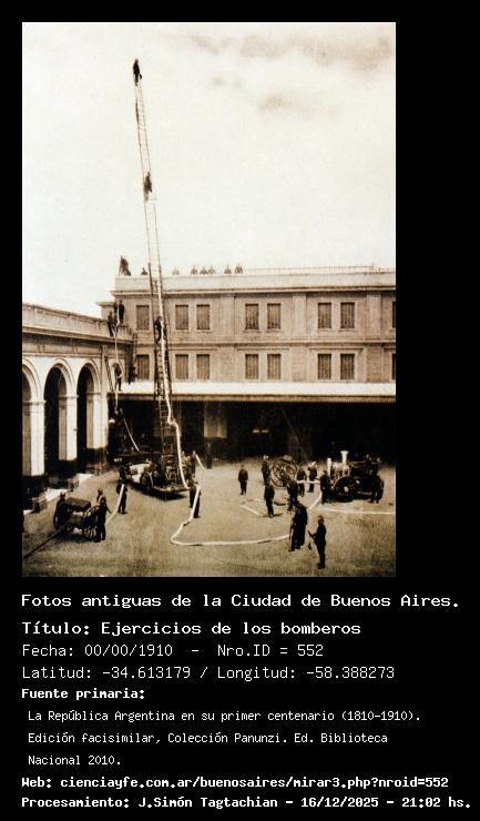 Ejercicios de los bomberos - 00/00/1910 - [552] - Orden: 112 Desde el 11 de marzo de 1889 el cuartel de bomberos estuvo en la planta baja del edificio de Policía de Belgrano (entre Virrey Ceballos y Luiz Sáenz Peña). Estos ejercicios probablemente sean en el patio interno.