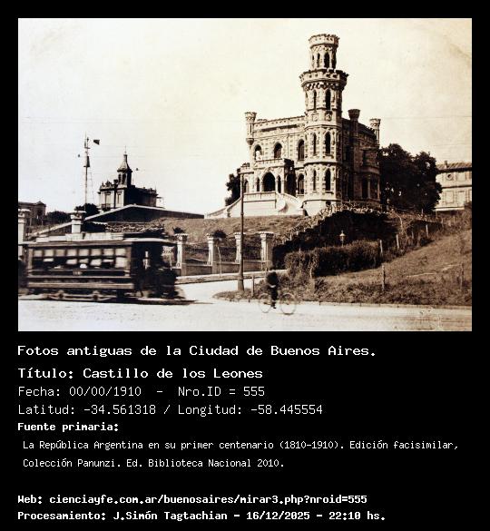 Castillo de los Leones - 00/00/1910 - [555] - Orden: 115 El Palacio fue construido por Il conde Ernesto Patrizio de Castiglione, había llegado -por segunda vez- a la Argentina a finales de 1898. Tras la estafa de su dueño (que desapareció) con un sistema de pensiones , la mansión fue subastada y la adquirió el Dr. Teófilo Lacroze, hijo de Federico.