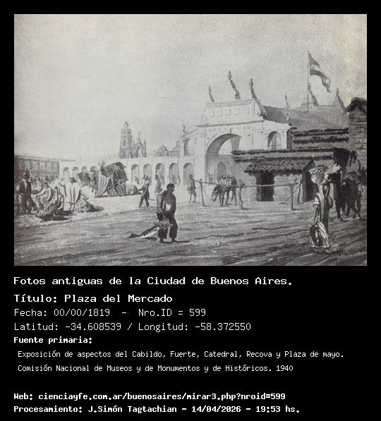 Plaza del Mercado - 00/00/1819 - [599] - Orden: 5 Acuarela de E.E. Vidal. Este es el solar ocupado por la Plaza de la Victoria. Atrás se ve claramente la Iglesia de La Merced.