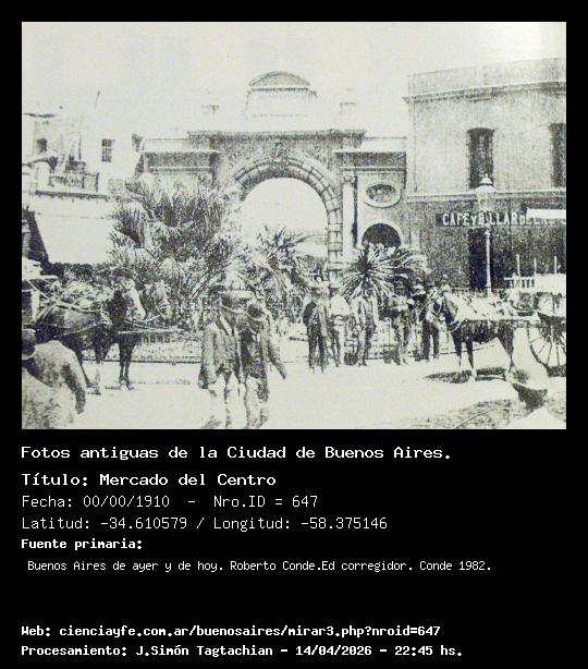 Mercado del Centro - 00/00/1910 - [647] - Orden: 46 Fecha aproximada. Estaba ubicado en la manzana que delimitan Perú, Alsina, Chacabuco y Moreno. Acá estamos en la entrada principal, Perú y Alsina, pero había dos más: una en Moreno y Chacabuco y otra entrada lateral, sobre Chacabuco. Este mercado existió hasta 1931 donde dejó lugar a la Diagonal. Hoy está el monumento a Roca.