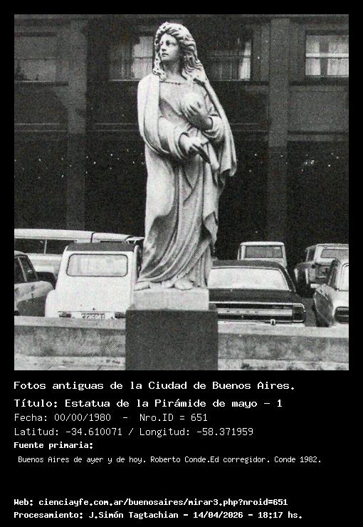 Estatua de la Pirámide de mayo - 3 - 00/00/1980 - [653] - Orden: 76 Esta estatua del viejo Banco Provincia y fue ubicada en la pirámide de mayo de 1878 a 1884. Ahora está ubicada (son cuatro en total) en la placita frente a la Iglesia de San Francisco.