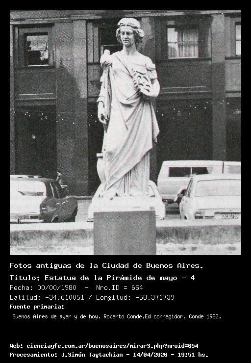 Estatua de la Pirámide de mayo - 4 - 00/00/1980 - [654] - Orden: 77 Esta estatua del viejo Banco Provincia y fue ubicada en la pirámide de mayo de 1878 a 1884. Ahora está ubicada (son cuatro en total) en la placita frente a la Iglesia de San Francisco.