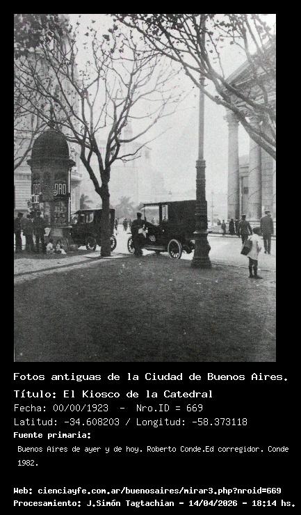 El Kiosco de la Catedral - 00/00/1923 - [669] - Orden: 51 Estos kioscos abundaban en Buenos Aires y la asimilaban a París. Este siempre llama la atención porque tiene un cartel que dice "oro". Está justo frente a la Catedral y ¡sale un muchas de sus fotos!