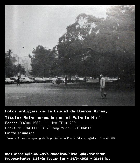 Palacio Miró - 00/00/1900 - [701] - Orden: 43 El Palacio Miró estaba en Viamonte y Libertad. Se construyó en 1884 y se demolió en 1937 (para agrandar la Plaza Lavalle ¿?). Sobrevive el Ficus de la esquina, hoy gigante. También otros árboles de su parque interno.