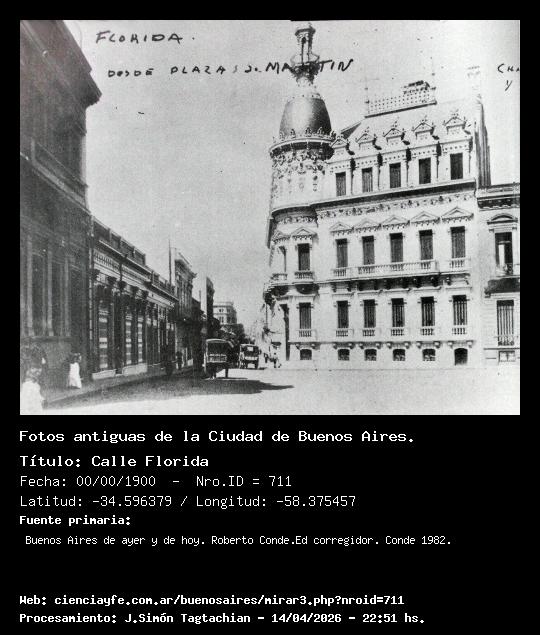 Calle Florida - 00/00/1900 - [711] - Orden: 44 Florida y Charcas -hoy Marcelo T. de Alvear-. Se destaca el edificio de don Ignacio Sánchez Elía, con su cúpula apizarrada. Sobre el lado izquierdo, Florida 999, la residencia de don Ernesto Torqnquist, realizada por el Arq. Carlos A. Altgelt.