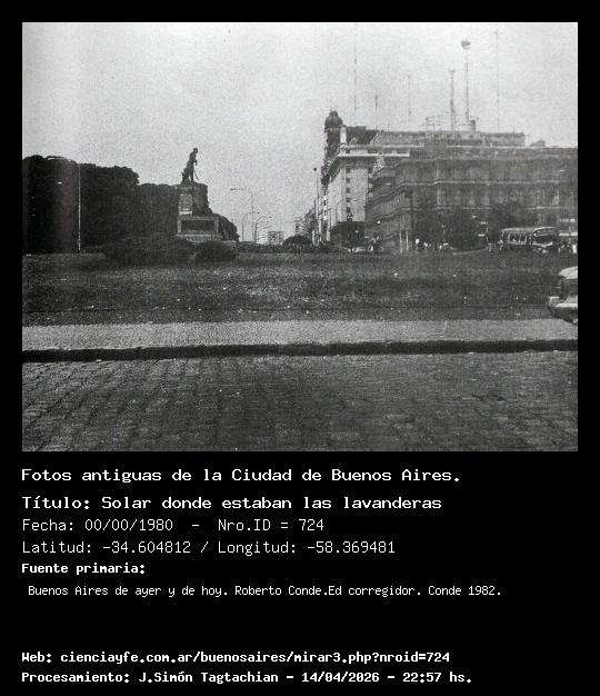 Solar donde estaban las lavanderas - 00/00/1980 - [724] - Orden: 112 Las lavanderas iban al Río a lavar la ropa (hasta 1889 en que se prohibió). El lugar es la plaza que se encuentra frente al Palacio de Correos -en breve, centro cultural-. El terreno fue rellenado cuando se construyó Puerto Madero.
