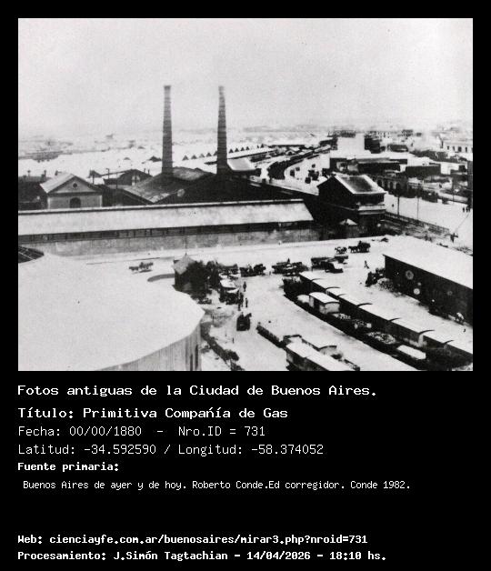 Primitiva Compañía de Gas - 00/00/1880 - [731] - Orden: 17 El techado que se destaca en la parte inferior izquierda pertenece al hotel de inmigrantes. Las playas y galpones del lado derecho estaban vecinas a la primitiva estación Retiro (hoy el edificio de Ferrocarriles). La Primitiva Compañía de Gas estaba en lo que hoy es la Plaza Britania -se ven las dos chimeneas-. Los galpones con techo a dos aguas eran depósitos conocidos como 'Catalinas Norte' (luego se instaló allí el Parque Japonés).