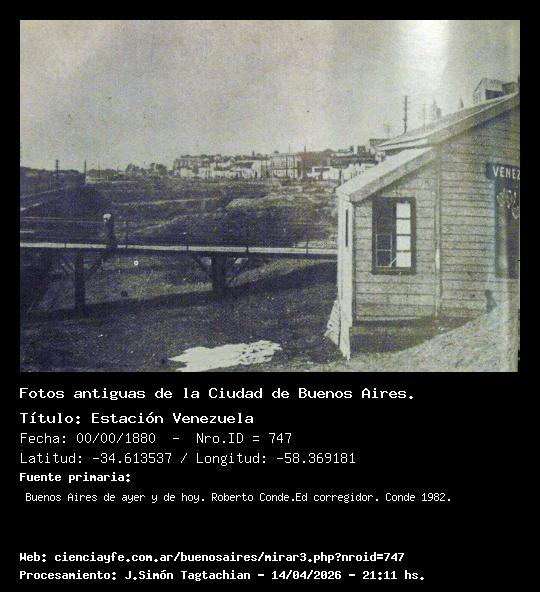 Estación Venezuela - 00/00/1880 - [747] - Orden: 21 Estación Venezuela, cabecera del Ferrocarril Ensenada. Su punto de partida era una pobre casilla de madera unida a un desguarecido andén por medio de una pasarela. Este ferrocarril se inauguró el 22/feb/1863. El recorrido de esta línea era un viaducto elevado a tres metros. La gente lo consideraba inseguro y tenía pocos pasajeros.