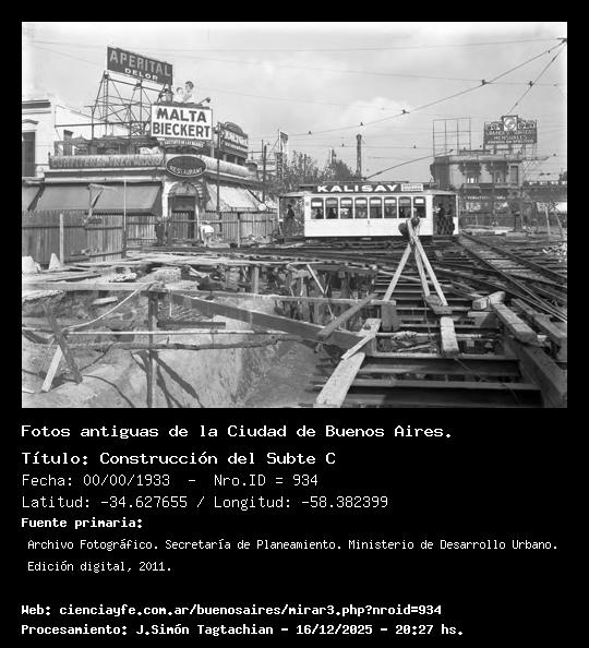 Construcción del Subte C - 00/00/1933 - [934] - Orden: 1 De los establecimientos antiguos, uno que tenía sus buenos ribetes de historia era el de la confitería llamada “Tren Mixto”, sobre el ángulo sudoeste de las calles Brasil y Lima. Fundado en 1888, se constituyó en el punto preferido de cuanto estanciero, político y hombre de negocios rurales se ausentara a los pueblos de la provincia, o regresara de ellos. “El nombre del Tren Mixto, -diría esto en una crónica del 5 de febrero de 1961, fecha ésta de su desaparición- lo había tomado del tren de tal denominación, y creció a la par del tránsito de esa línea ferroviaria del Sur (/www.revisionistas.com.ar/?p=11168).