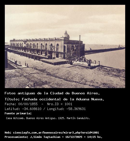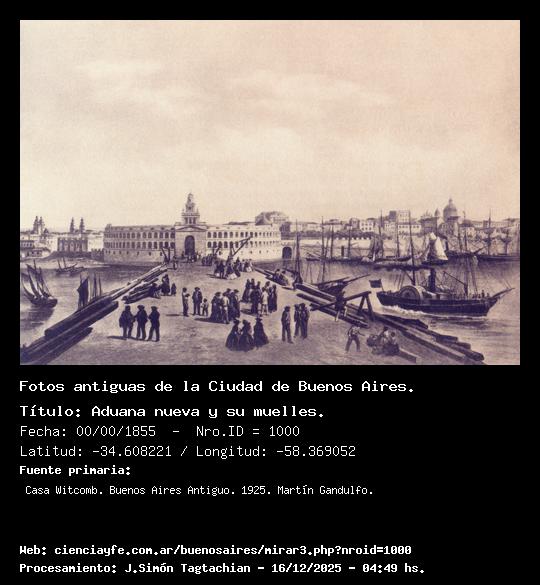 Aduana nueva y su muelles. - 00/00/1855 - [1000] - Orden: 10 Durante la administración del Gobernador de Buenos Aires, don Pastor Obligado, se construyó este desaparecido edificio, cuya fachada hacia el río era semicircular y de su punto más avanzado arrancaba el muelle. Sobre el frontón de la puerta central se elevaba una torre rematada en un pequeño faro, luz que, durante casi medio siglo, sirvió de guía a los navegantes del estuario.