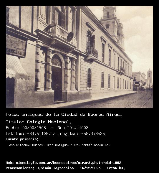 Colegio Nacional. - 00/00/1905 - [1002] - Orden: 39 Esta fachada fue demolida, conjuntamente con el edificio y casas colindantes hacia la calle Moreno, para la reedificación y ensanche del Colegio. El primitivo edificio perteneció, con su respectiva iglesia San Ignacio, a la Compañía de Jesús hasta la época de la expulsión (1767), y en él comenzó a funcionar en 1783, con 57 alumnos el Colegio San Carlos, nombre que conservó hasta 1817 en que fue substituido por el de [de la Unión del Sur]; hata que, finalmente en 1864, con motivo de la reorganización de los estudios secundarios, recibió el de Colegio Nacional.