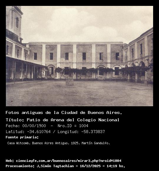 Patio de Arena del Colegio Nacional - 00/00/1900 - [1004] - Orden: 38 El patio de arena era el espacio destinado al esparcimiento de los alumnos. Tenía árboles y parras y un aljibe. Todo eso desapareció cuando se comenzaron los trabajos del nuevo Colegio Nacional de Buenos Aires. En el patio, claustros, galerías y aulas del histórico Colegio se realizó la primera exposición industrial de la República, que inauguraron el presidente Avellaneda y el gobernador de Buenos Aires, Carlos Casares, el 15 de enero de 1877.