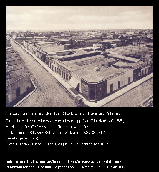 Las cinco esquinas y la Ciudad al SE. - 00/00/1925 - [1007] - Orden: 43 La foto muestra el ángulo de la calle Libertad y Juncal. Al fondo, se toda la Ciudad hasta el río. En pocas vistas de la época, como en ésta, es dado poder apreciar el tipo casi uniforme de casas bajas predominante hasta la iniciación de las grandes reformas edilicias, cuando federalizada Buenos Aires, su intendencia municipal fue puesta, por el presidente Roca, en manos de don Torcuato de Alvear. El mismo Alvear edificó su residencia en el solar baldío de la esquina de Juncal y Cerrito.