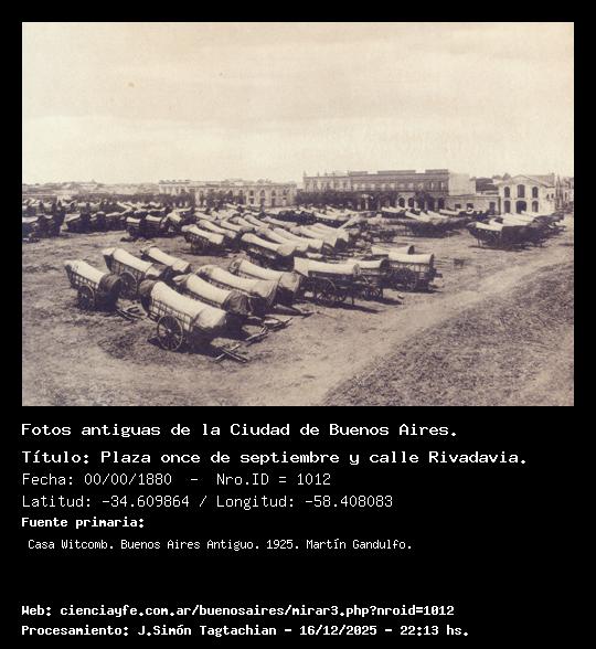Plaza once de septiembre y calle Rivadavia. - 00/00/1880 - [1012] - Orden: 32 En la época de embarque de frutos no era raro que el amplio espacio del entonces Mercado de Once, resultase con frecuencia estrecho para contener las carretas que a él acudían. Frente al mercado y en sus alrededores era considerable el número de locales que, bajo el nombre de barracas y corralones, estaban destinados a depósitos de lanas, cueros, etc. Esto dejó de ser necesario cuando se hizo el Mercado central de frutos, sobre la ribera derecha del Riachuelo.